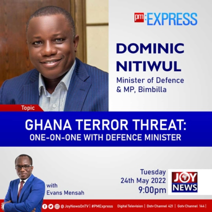 Tonight on PM Express, host, Evans Mensah, will be discussing the threat of terrorism in Ghana and the country's preparedness with the Defence Minister, Dominic Nitiwul.