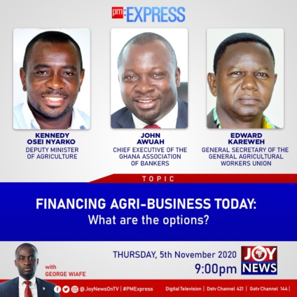 Deputy Agriculture Minister, Kennedy Osei Nyarko, Chief Executive of the Ghana Association of Bankers, John Awuah, and Deputy General Secretary of the General Agricultural Workers Union, Edward Kareweh will answer questions that will inform your decision on any future business in the agric sector.
