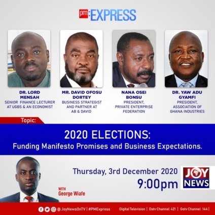 George Wiafe, host of the Business Edition of PM:Express, will speak with some business resource persons on the topic: Funding Manifesto Promises and Business Expectations.