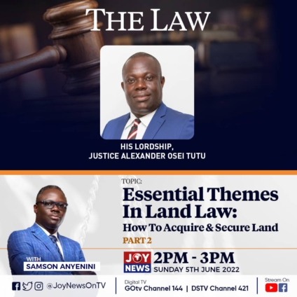 This afternoon on The law, Host, Samson Anyenini discussed with His Lordship, Justice Alexander Osei Tutu, the legal processes involved in acquiring and securing land in Ghana.