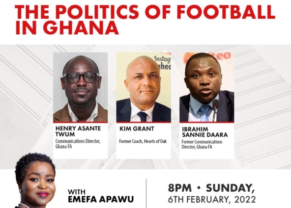 Joining her for the conversation is former Hearts of Oak coach Kim Grant, Communications Director of the Ghana Football Association, Henry Asante Twum and a former Communications Director of the Ghana Football Association Ibrahim Saanie Daara.