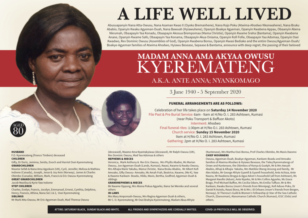 Abusuapanyin Nana Atta-Owusu, Nana Asaman Kwao II (Oyoko Bremanhene), Nana Kojo Poku (Atwima-Ahodwo nkonwahene) Nana Bruku Ababio, Opanyin Kwaku Agyeman-Duah, Nana Bawuah (Hyiawuheneannounce with deep regret, the passing of their beloved, MADAM ANNA AMAAKYAA OWUSU KYEREMATENG    Â