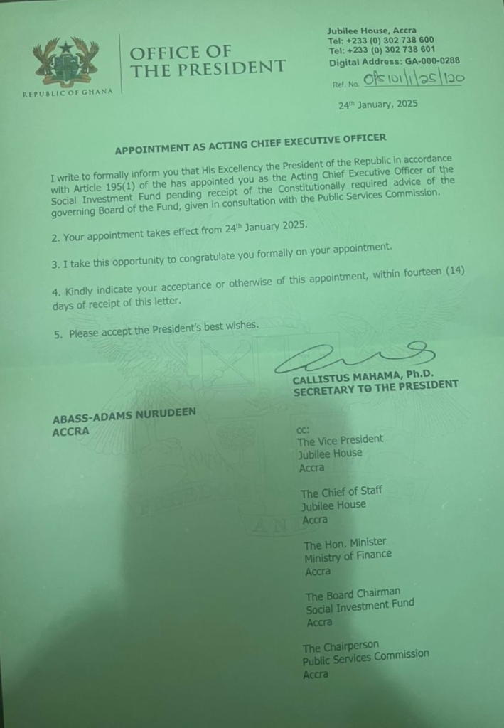 President John Mahama has appointed the Ashanti Regional Communications Officer of the National Democratic Congress (NDC), Abass-Adams Nurudeen, as the Acting Chief Executive Officer (CEO) of the Social Investment Fund.
