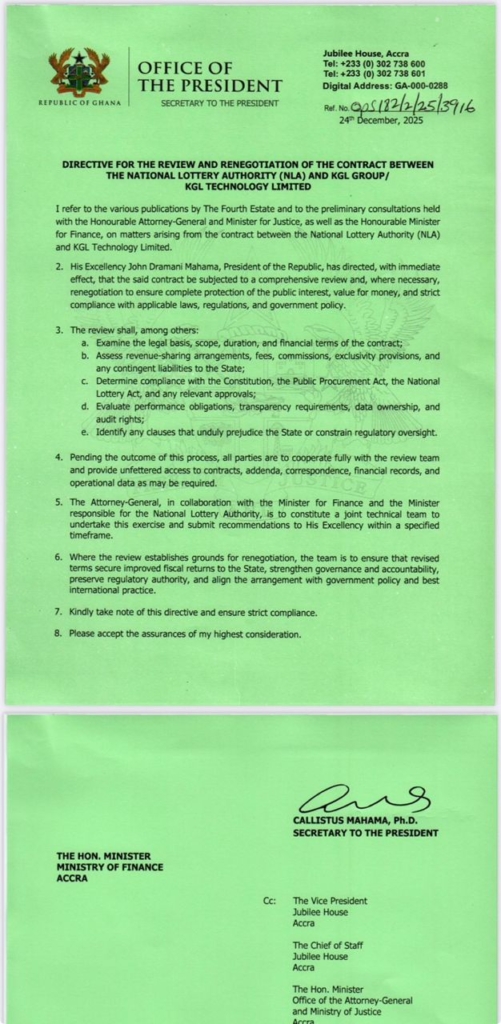 President John Mahama has directed a comprehensive review and potential renegotiation of the contract between the National Lottery Authority (NLA) and KGL Group/KGL Technology Limited.