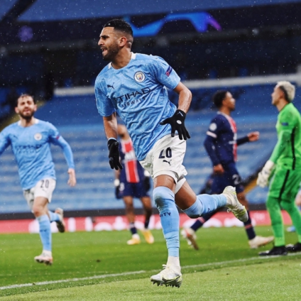 In a game played in unseasonal snow, the brilliant Riyad Mahrez capped a sweeping move started by goalkeeper Ederson's 60-yard pass to extend their 2-1 advantage from the first leg in Paris.