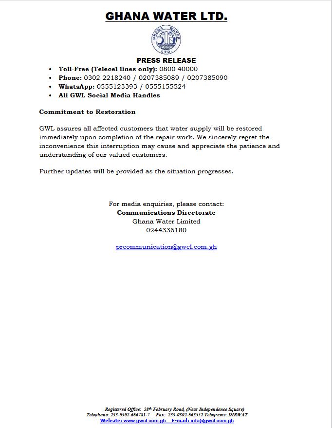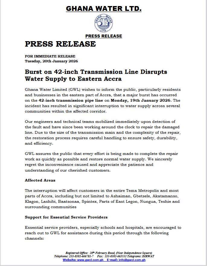 Residents and businesses in the Tema Metropolis and several parts of Accra are expected to experience a temporary disruption in water supply following a major burst on a 42-inch transmission pipeline, Ghana Water Limited (GWL) has announced.
