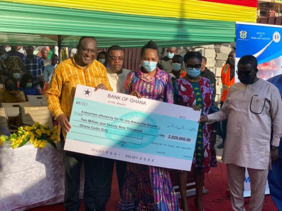 The Ministry of Trade and Industry has presented a cheque of ¢2.29 million to enterprises affected by the July 5th, 2021 Makola fire disaster.
