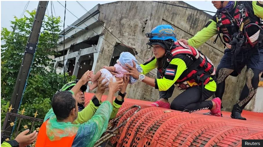 One video, filmed in Thailand's Sateng Nok district, showed rescuers carrying a baby out from a roof of a flooded home.
