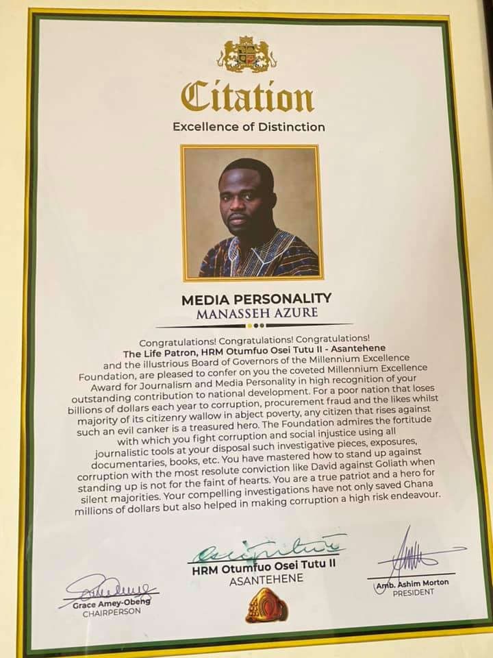 Investigative journalist, Manasseh Azure Awuni has received the coveted Millennium Excellence Award for Journalism and Media Personality.