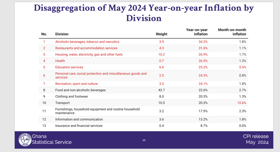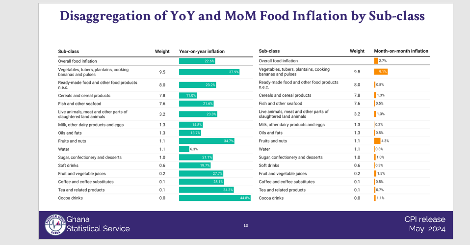 According to the data released by the Ghana Statistical Service, food inflation declined by 4.2% to 22.6% while non-food inflation increased to 23.6%.