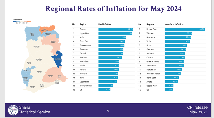 The Upper East region recorded highest regional inflation rate at 35.6%. This represents more than 3 times that of the Oti region (the region with the lowest Inflation) with 10.3% inflation for the month of May 2024.