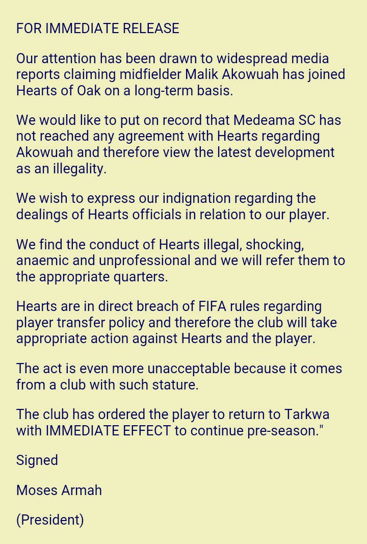 Medeama SC have ordered for the immediate return of Malik Akowuah to the club hours after Hearts of Oak confirmed his capture.