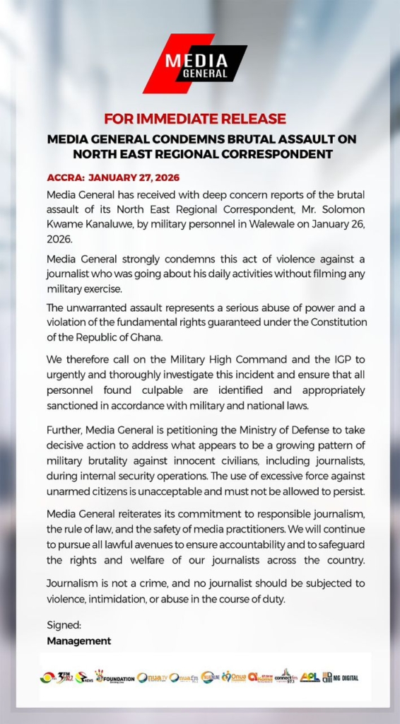 Media General has condemned the brutal assault on its North East Regional Correspondent, Mr Solomon Kwame Kanaluwe, allegedly by military personnel in Walewale.