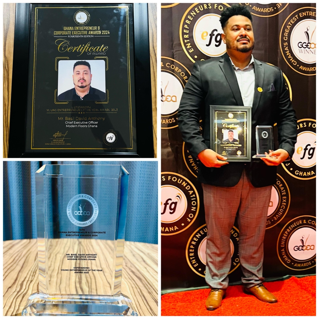 The Chief Executive Officer of Modern Floors Ghana has been honoured with the ‘Outstanding Young Entrepreneur of the Year’ Award 2023 at the fourteenth edition of the Ghana Entrepreneurs and Corporate Executives Award Gala Dinner, held on Saturday, March 16, 2024, at the Movenpick Ambassador Hotel.