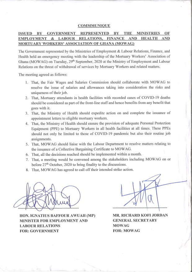 The Mortuary Workers Association of Ghana (MOWAG) has called off its nationwide strike which was scheduled for October 1.