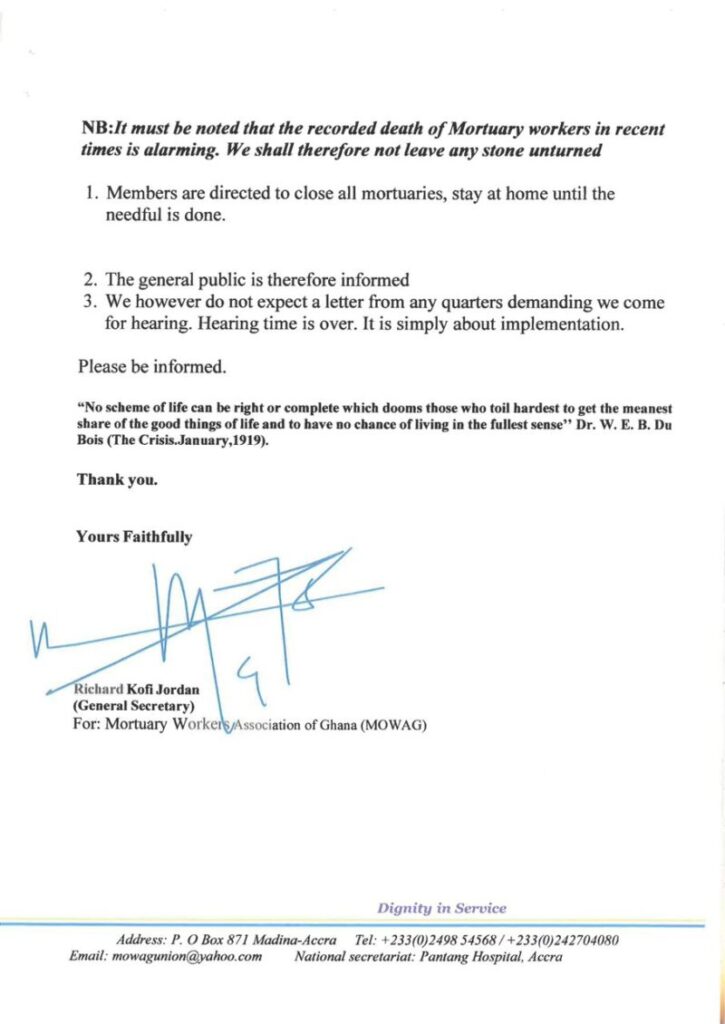The Mortuary Workers Association of Ghana (MOWAG) disclosed its decision in a press statement on Tuesday, September 17, citing the government's failure to address long-standing demands for improved pay, better working environment, and adequate personal protective equipment (PPE).