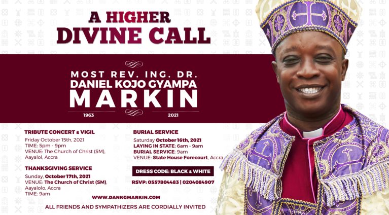 Barima Offeh Akwasi Okogyeasuo II, Kokofumanhene, Nenyi Ghartey VII, Omanhene of Effutu Traditional Area, Nana Atakora Bonsra I, Kokofu Kronkohene, Nana Asare Brempong II, Wassa Atobiasehene, Nana Frimpomaa II Wassa Atobiasehemaa, Opanin I.K. Atakora (Kronko Abusuapanin Kokofu), Nana Kobina Siaw (Asomankoma Abusuapanin, Atobiase), Mr. Emmanuel ColeCraft (Ebusuapanin of Markin family), The Spiritual Council - Governing Body of The Church of Christ (SM) and the bereaved families regret to announce with deepest sorrow and sadness the transition of our beloved Most Rev. Ing. Dr. Daniel K.G. Markin which sad event occurred on July 30, 2021, at the 37 Military Hospital in Accra.