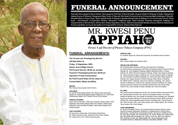 Aboradze Ebusuapaynin Nana Debrah, Ebusuapaynin Kofi Etsin of Akumfe Asafa, Abusua Obatan Kofi Abaye of Asafa, Obaapanyin Adwoa Kosma of Takoradi, Obaapanyin Mary Ocran of Takoradi, Mrs Sarah Chinock of Accra, Emmanuel Baah & siblings of Takoradi, Elizabeth Brew of Cape Coast, Taylor-Appiah family of Saltpond, Apostle George Ayiku & siblings of Love Community Church, Nana Eyaa I, Adontenhene of Akyempim Division- Nkusukum Traditional Area, Nana Damoah Koasane Adusepoku Kofabaye IV, Akyeamehene of Wenchi-Bono, the Donkoh, Nketia, Nyantekyi-Owusu, Effah and associated families of Accra, Wenchi, Asokore and Kumasi regretfully, announce the death of their beloved: