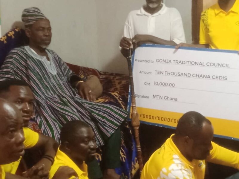 Management of MTN in Northern and Savannah Regions has presented a cheque amount of Ten Thousand cedis to Yagbonwura Bii-Kunuto Jewu Soale I at his palace in Damongo in the Savannah Region.