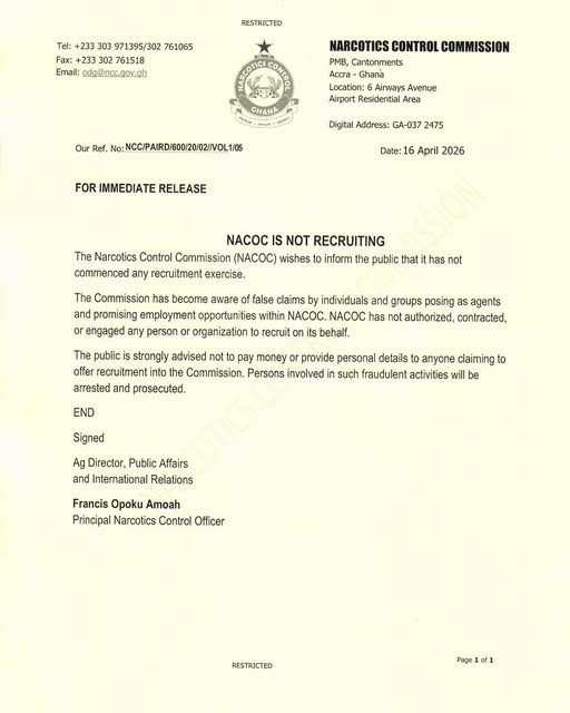 The warning follows reports of individuals and groups posing as agents of NACOC and promising jobs within the organisation. According to the commission, these claims are false and unauthorised.