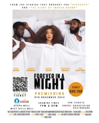 Fans and movie enthusiasts can look forward to the grand premiere of "Forever In A Night" produced by John N. Okwugo and directed by Jameel Buari on November 9, 2024, at the Accra Mall and West Hills Mall in Greater Accra.
