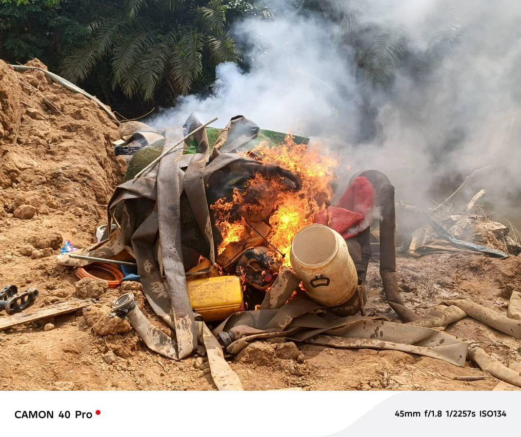 The task force subsequently burnt five (5) pumping machines and destroyed several water hoses and makeshift structures erected by the galamseyers to support their activities.