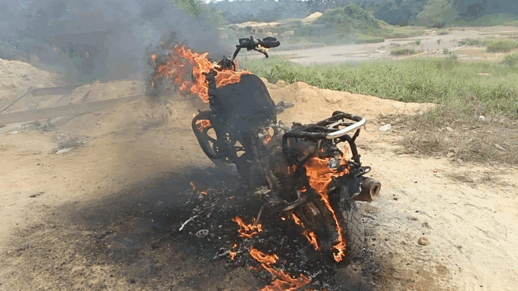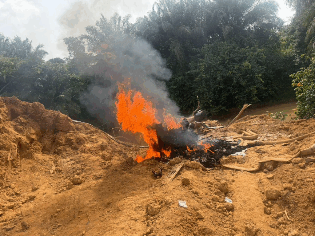 The miners had also destroyed large areas of palm plantations within the enclave. Following the escape of the miners, the task force destroyed the industrial pumping machines and other illegal mining equipment at the site by burning.