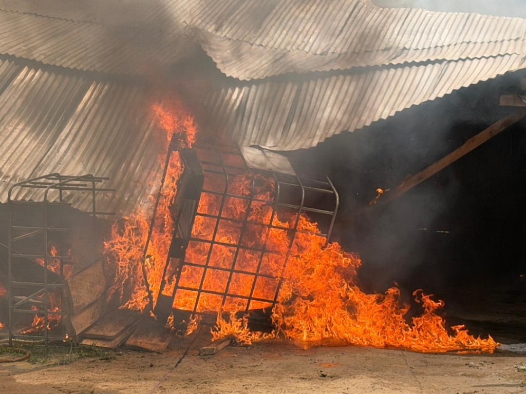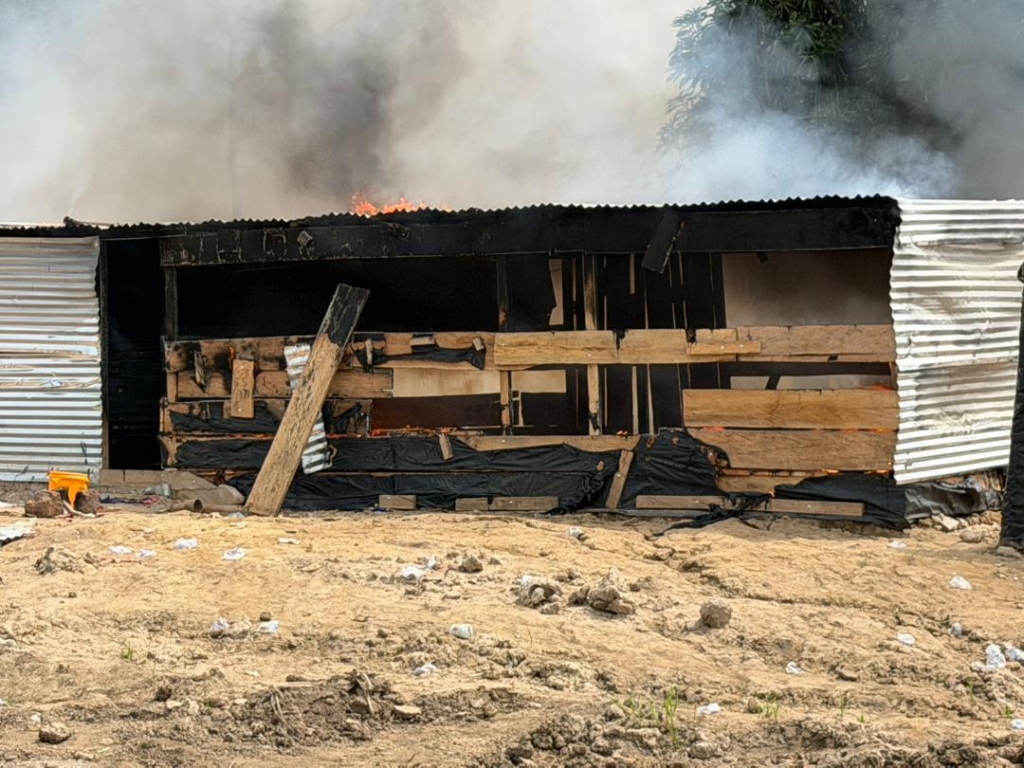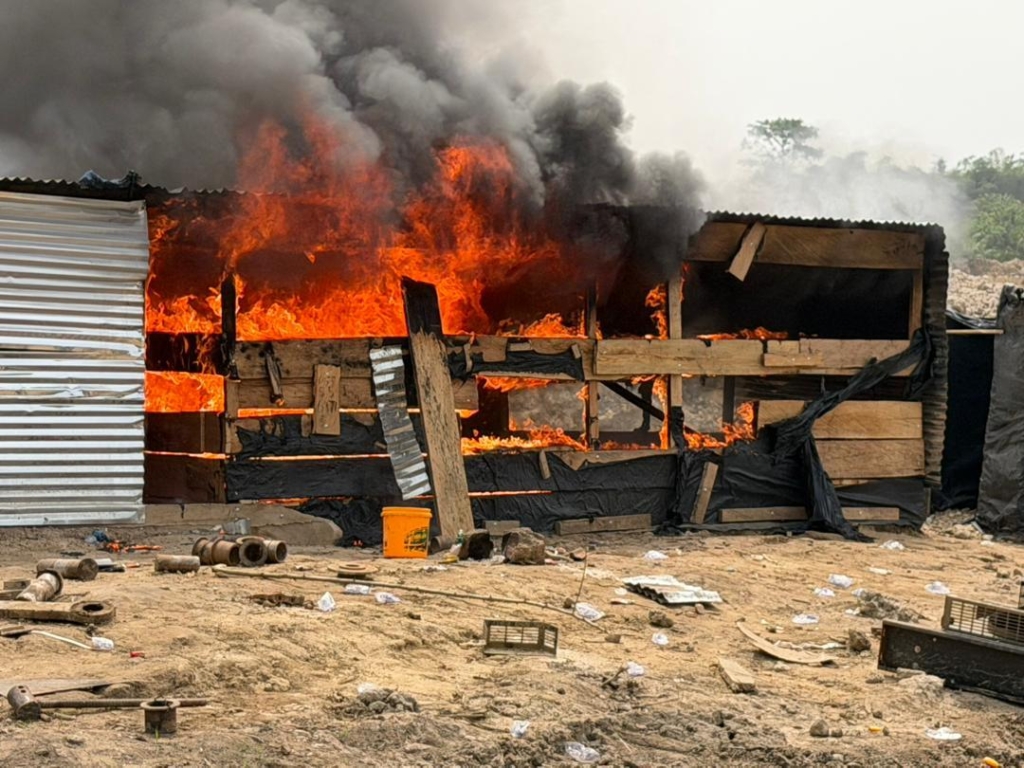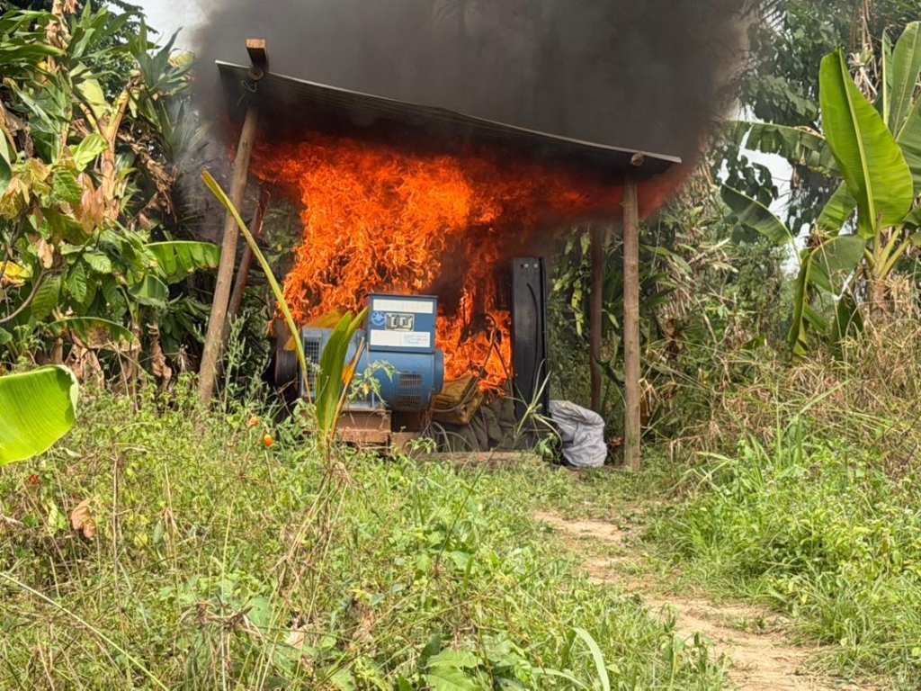 The NAIMOS team destroyed remaining infrastructure, including a heavy-duty multipurpose water pumping machine, and seized or burned materials such as drums, excavator batteries, plastic chairs, and barrels.