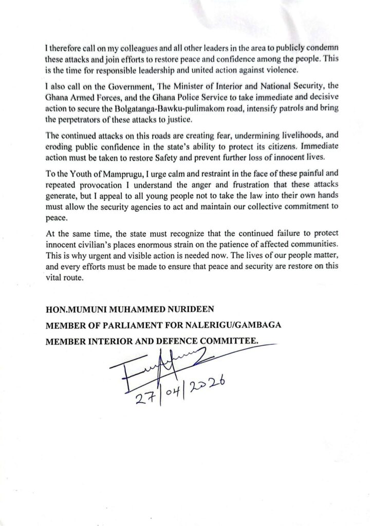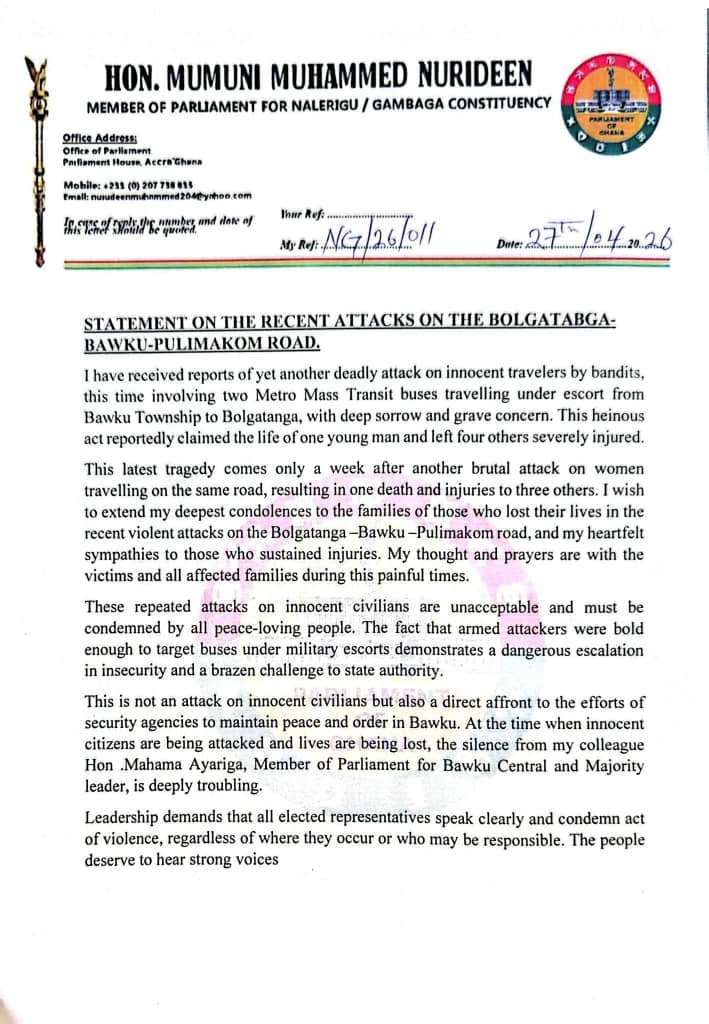 The Member of Parliament for Nalerigu/Gambaga, Mumuni Muhammed Nurideen, has strongly condemned the deadly attack on a military-escorted civilian convoy along the Bawku–Bolgatanga corridor, describing the incident as a tragic reminder of the persistent insecurity in the area.