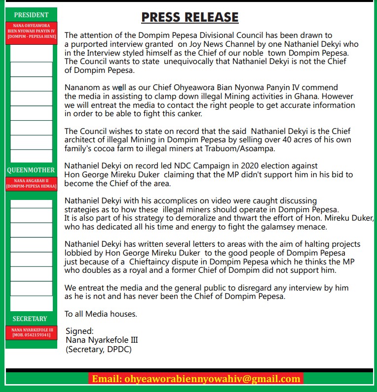 “We entreat the media and the general public to disregard any interview by him as he is not and has never been the Chief of Dompim Pepesa,” Nana Nyarkefole III, Secretary to the Council stated.
