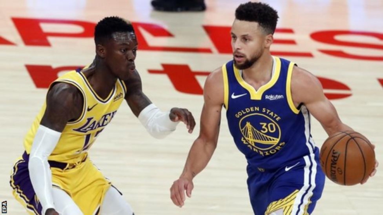 Curry scored a three-pointer with 1:07 left before the Lakers' LeBron James missed a three-pointer at the horn.