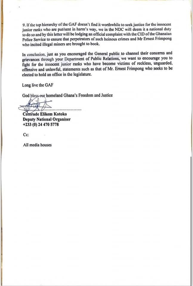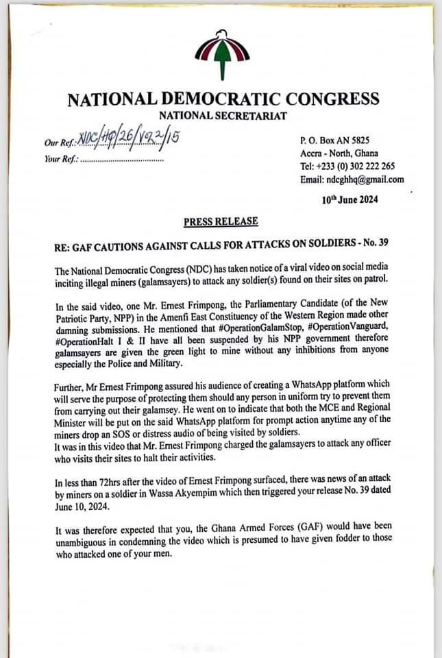 The National Democratic Congress (NDC) has criticised the Ghana Armed Forces (GAF) for its response to the viral video of Ernest Frimpong, the New Patriotic Party (NPP) MP hopeful's alleged inciting attacks against officers patrolling illegal mining sites.