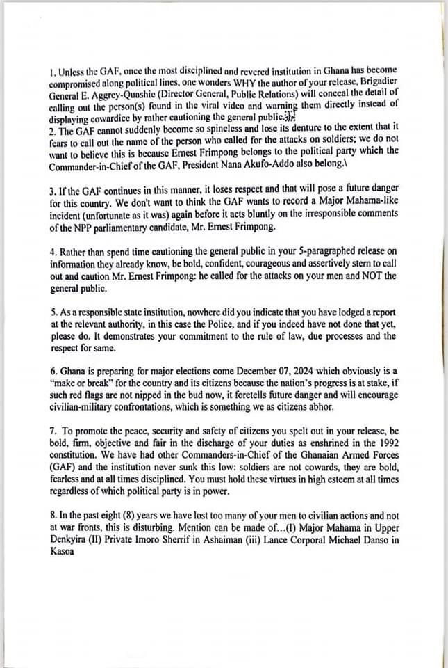 "Rather than spending time cautioning the general public in your five-paragraph release on information they already know, be bold, confident, courageous, and assertively stern in calling out and cautioning Mr. Ernest Frimpong. He called for the attacks on your men, not the general public."