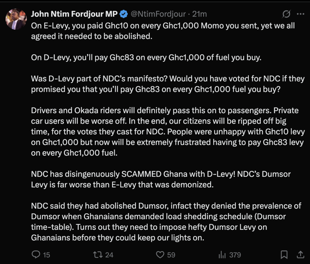 Ntim Fordjour pointed out the stark contrast between the recently abolished e-levy, which charged GH¢10 on every GH¢,1000 sent via mobile money, and the new Dumsor Levy, which imposes a fee of GH¢83 on every GH¢1,000 worth of fuel purchased.