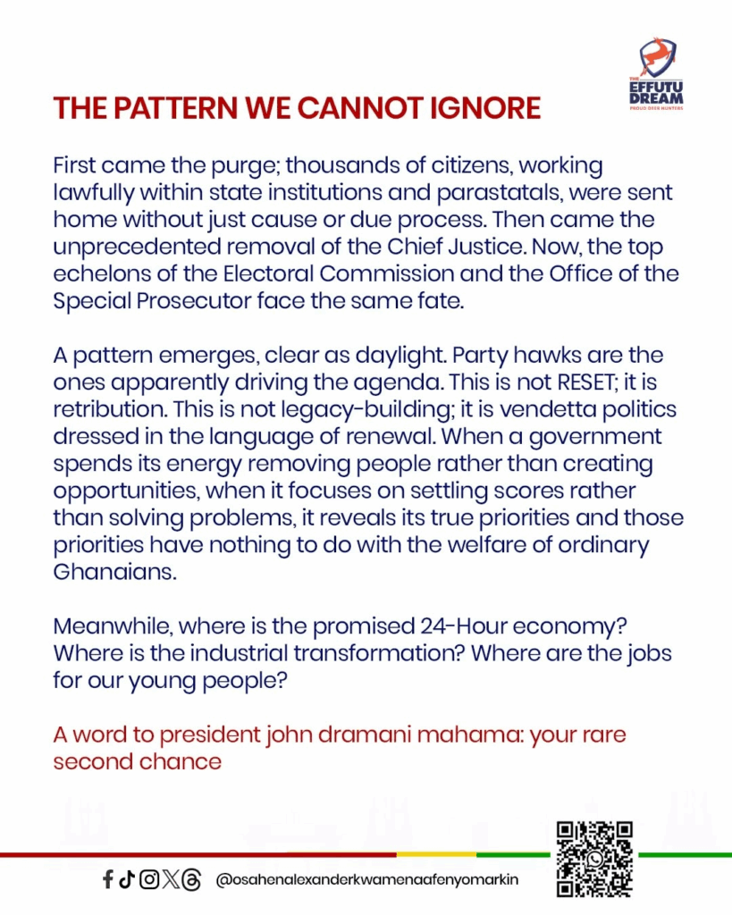 Mr Afenyo-Markin said the pattern of dismissals witnessed over the past year raises serious concerns about the direction of governance. According to him, the actions of the administration show a shift from national renewal to political retribution.
