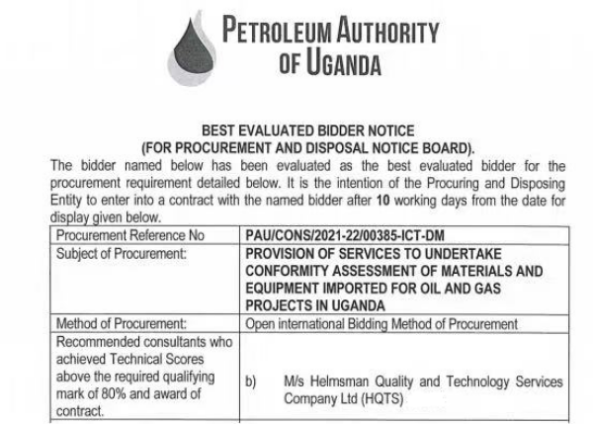 Helmsman Quality and Technology Services Company Ltd. (HQTS) Secures Contract for Pre-Export Verification of Conformity Assessments on Specialised Equipment and Materials for Uganda Oil and Gas Projects