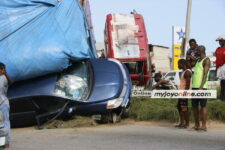 Woman escapes death as cargo truck tumbles on her saloon car at Amanfro