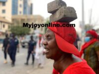 Lady carries blocks meant for Mahama during NDC ‘Yentua’ demonstration on E-Levy
