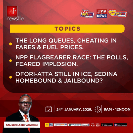 Newsfile airs live on the JoyNews channel on digital satellite channels 421 on DSTV and 144 on GoTV, and streams on JoyNews’ Facebook or YouTube channels on Saturdays from 9 am to noon.