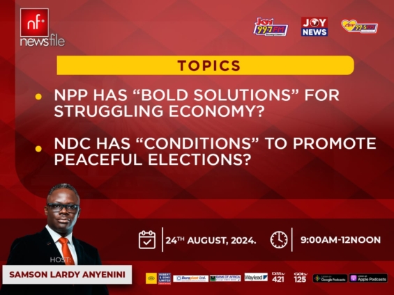 The Saturday's edition of JoyNews’ Newsfile will be discussing the New Patriotic Party's (NPP) solutions for the Ghanaian economy and the National Democratic Congress' (NDC) conditions to sign the peace pact ahead of this year's election.