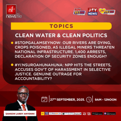 Join Samson Lardy Anyenini this Saturday at 9 a.m. on JoyNews, JoyFm 99.7, and MyJoyOnline, as we unpack whether the government is winning the fight against galamsey, and whether the growing unrest in the NPP signals a deeper crisis in governance.