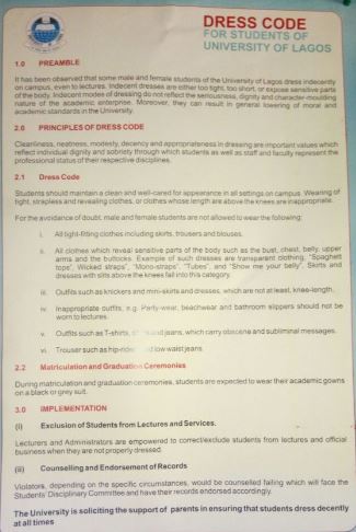The University of Lagos in Nigeria's commercial capital has banned both male and female students from wearing tight-fitting clothes, including trousers, skirts and blouses, local newspapers report.