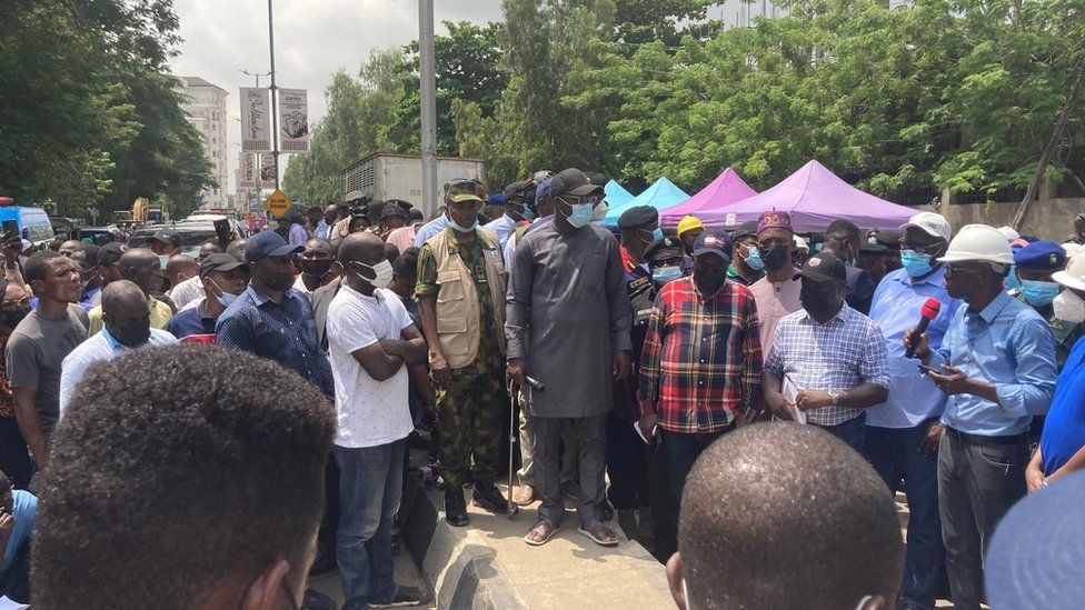 A rare silence engulfs the site as Lagos state Governor Babajide Sanwo Olu visits the site for the second time in less than 24 hours - the deference angers the relatives.