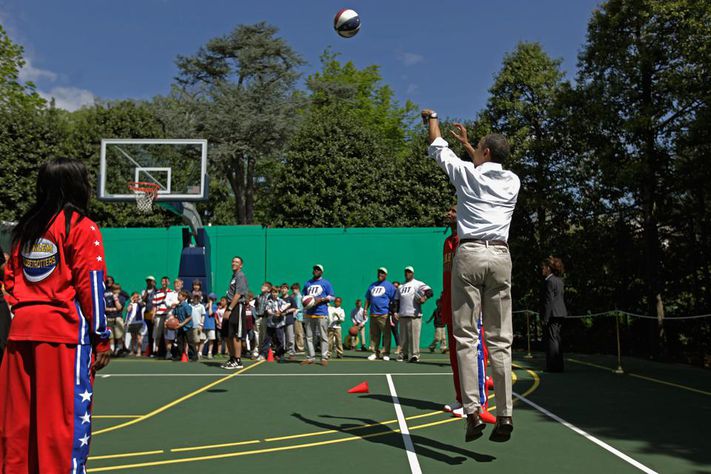 In 2009, the same year he was gifted the Nike sneakers, the White House tennis court pavilion was transformed into a makeshift basketball court for Obama.