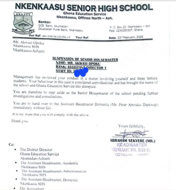 The Senior Housemaster of Nkenkaasu Senior High School, Akwasi Opoku, has been suspended following allegations of misconduct involving three female students.