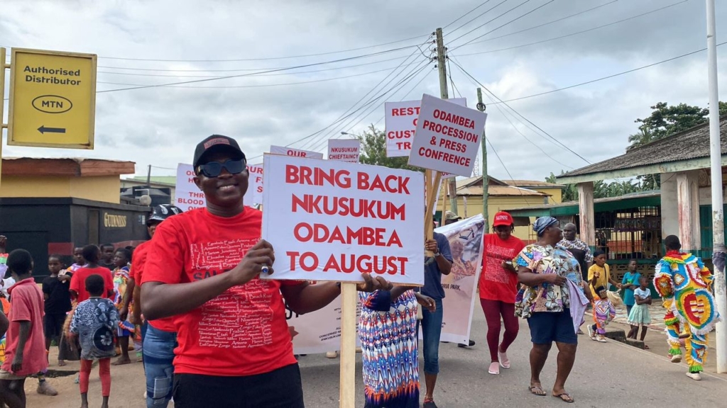 They were clad in red and held placards with inscriptions such as "Bring Back Nkusukum Odambea to August," "Reviving Traditions, Celebrating Unity," among others.