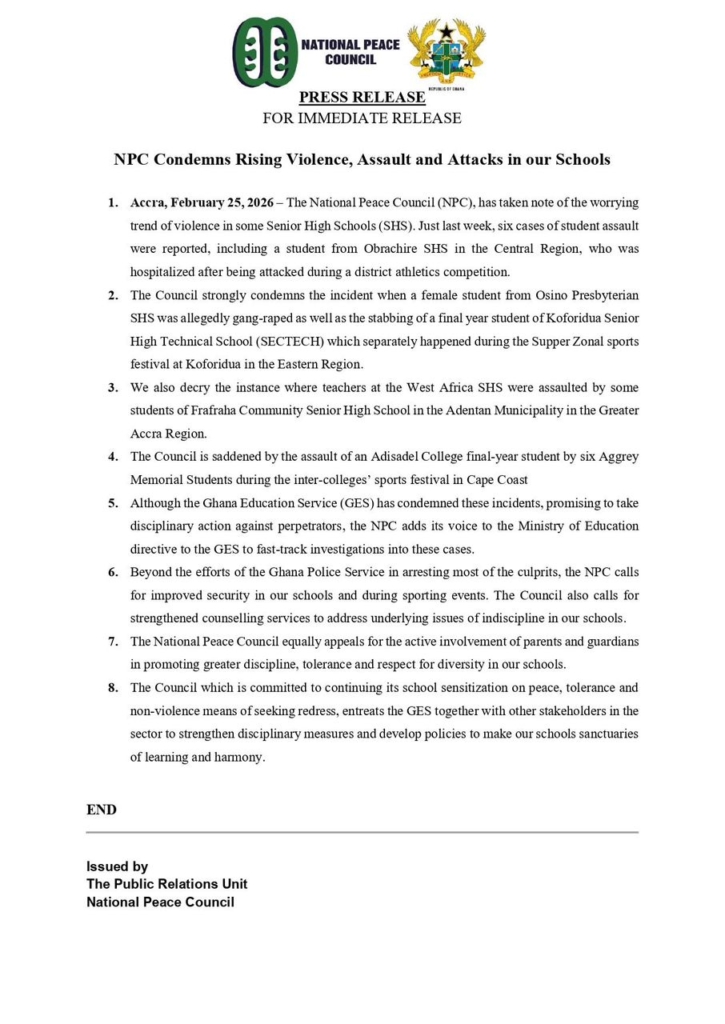 The National Peace Council (NPC) has expressed deep concern over a spate of violent incidents in some Senior High Schools (SHSs) across the country, calling for urgent action to safeguard students and staff.