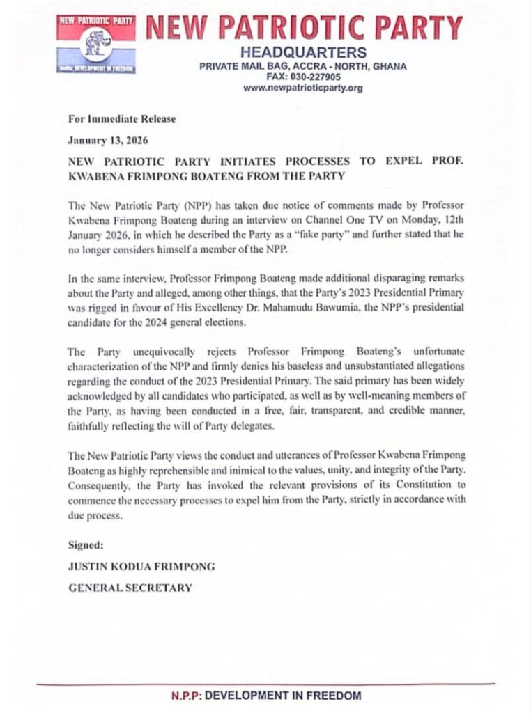 The New Patriotic Party (NPP) has begun formal processes to expel former Minister for Environment, Science, Technology and Innovation, Professor Kwabena Frimpong-Boateng, following comments he made in a television interview describing the party as “fake” and questioning its internal democratic credentials.