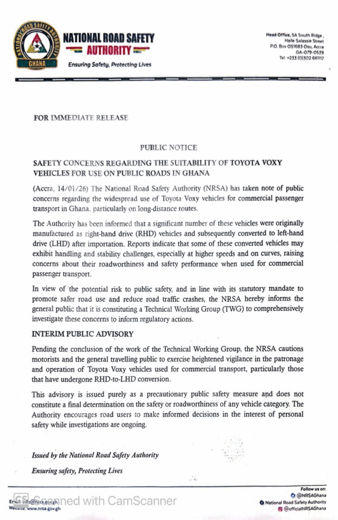 The National Road Safety Authority (NRSA) has issued a public advisory on the use of Toyota Voxy vehicles for commercial passenger transport in Ghana, particularly on long-distance routes, following concerns about their safety and roadworthiness.