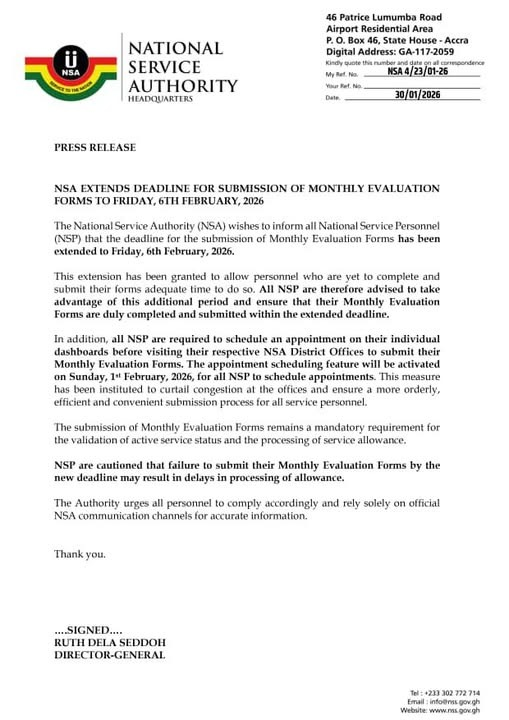 The National Service Authority (NSA) has extended the deadline for the submission of Monthly Evaluation Forms by National Service Personnel (NSP) to Friday, February 6, 2026.